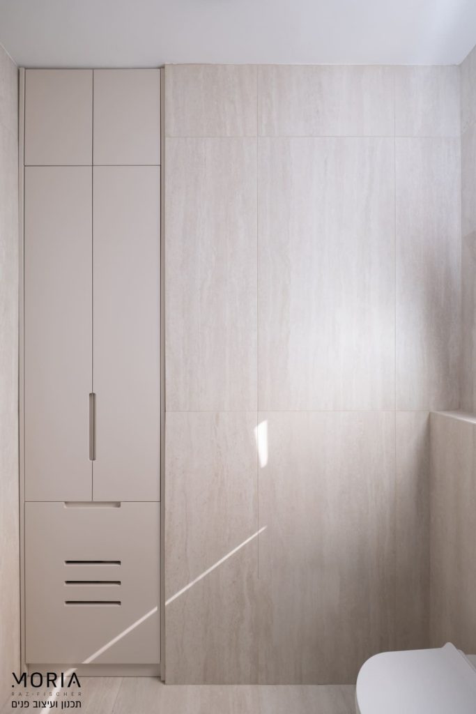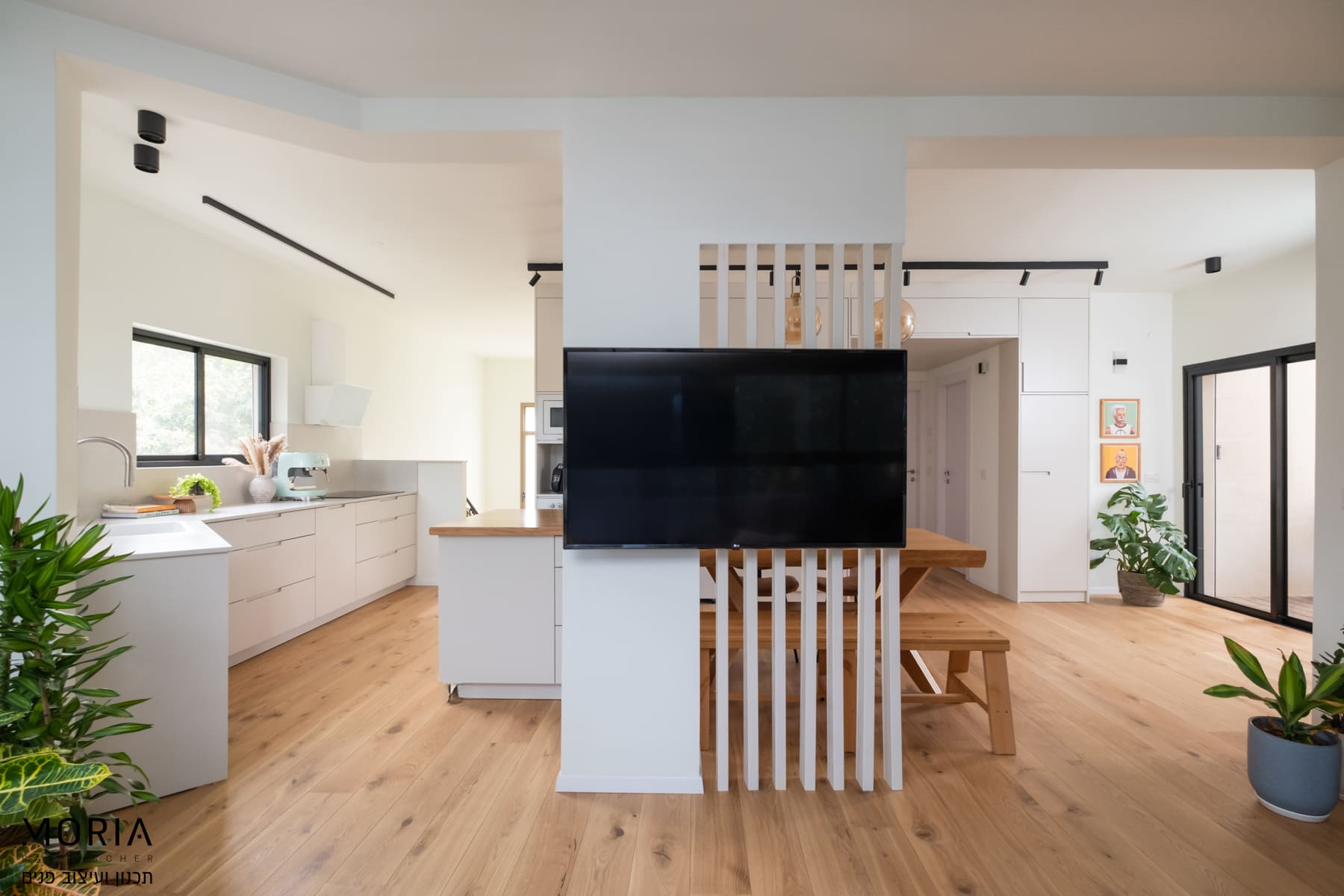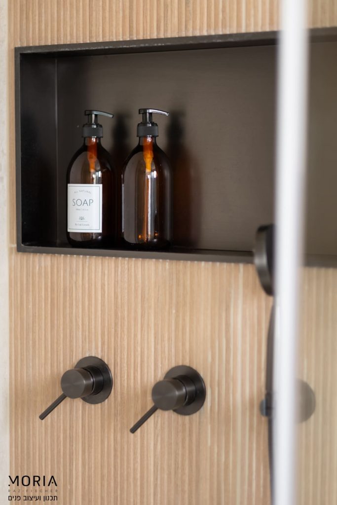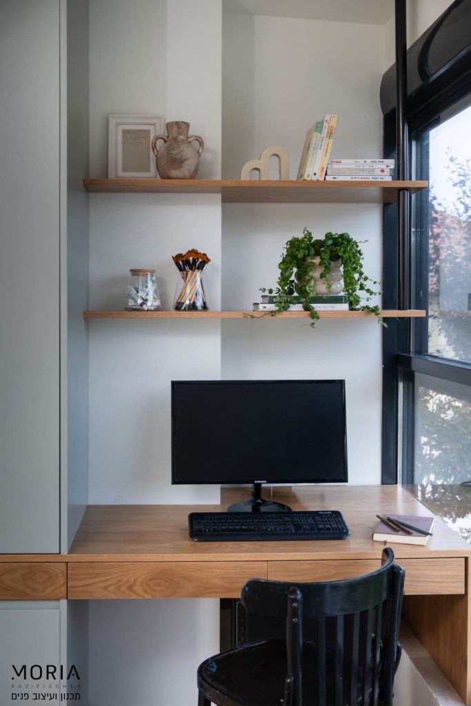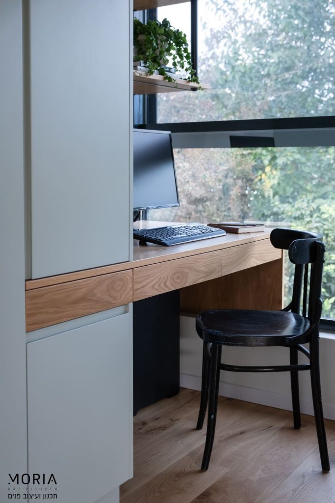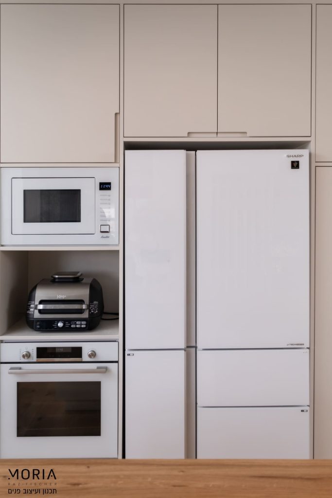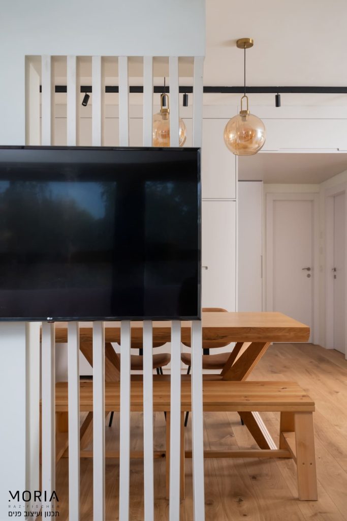 במקום לוותר על פונקציות בגלל אילוצים, נלחמתי על כל מילימטר: את גובה התקרה במסדרון ניצלתי לאחסון חכם של מזוודות, עמוד קונסטרוקטיבי הפכתי למחיצה מעוצבת לתליית טלוויזיה, והנגרות תוכננה בקפידה עם פתרונות יצירתיים – מהסתרת ארובה ועד ארון ייעודי לדייסון ומדף פנימי למדפסת.