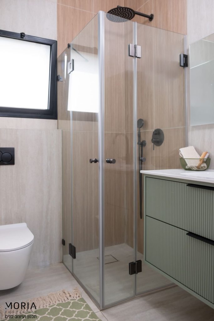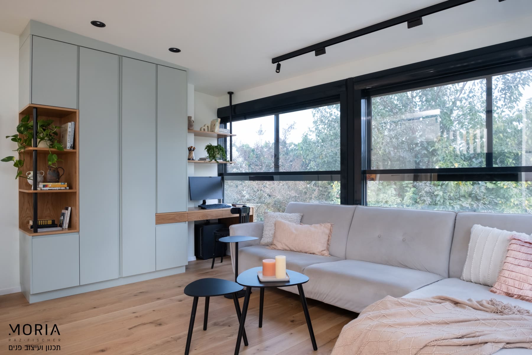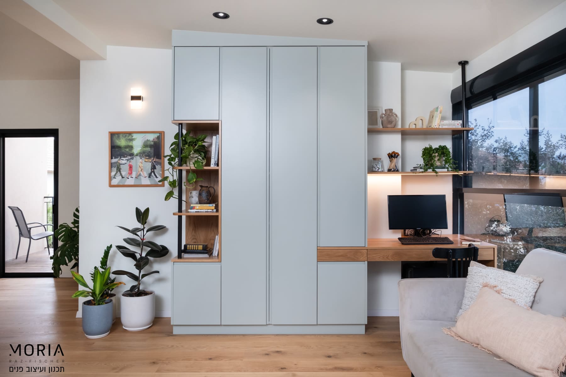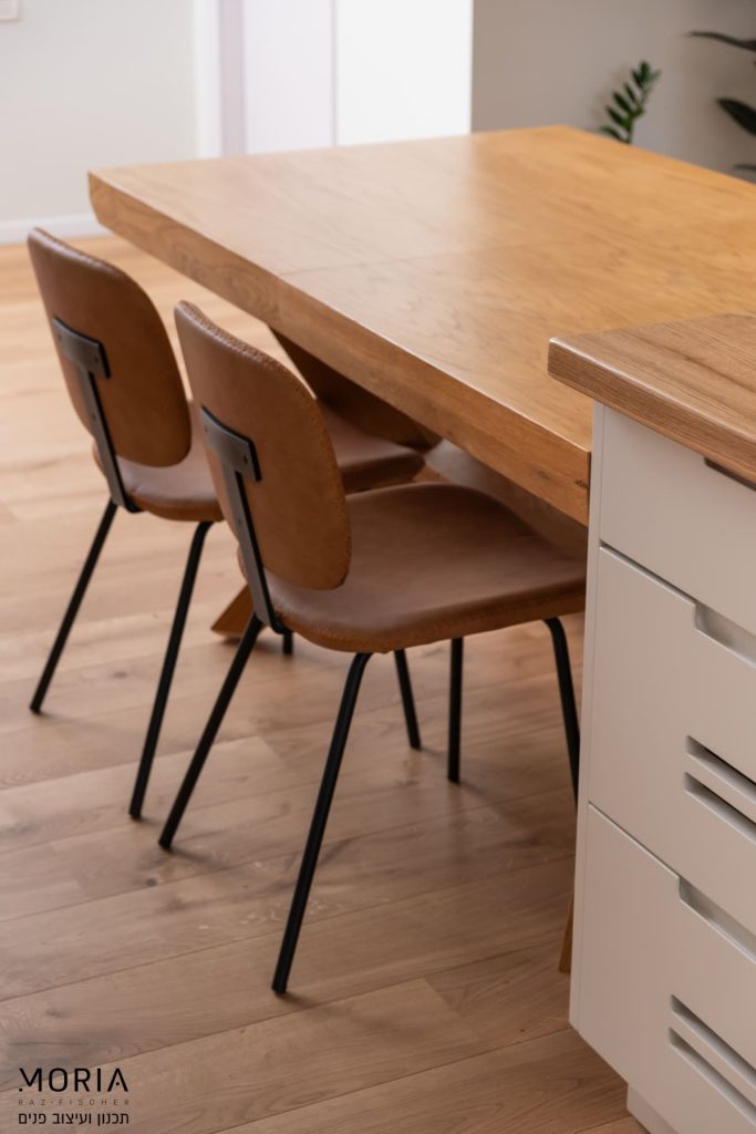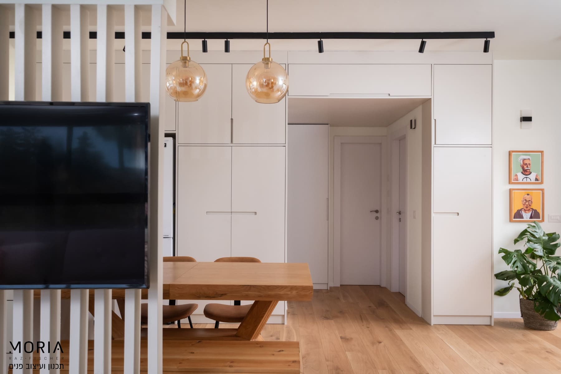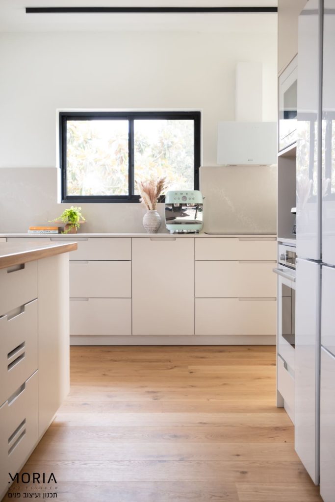 במקום לוותר על פונקציות בגלל אילוצים, נלחמתי על כל מילימטר: את גובה התקרה במסדרון ניצלתי לאחסון חכם של מזוודות, עמוד קונסטרוקטיבי הפכתי למחיצה מעוצבת לתליית טלוויזיה, והנגרות תוכננה בקפידה עם פתרונות יצירתיים – מהסתרת ארובה ועד ארון ייעודי לדייסון ומדף פנימי למדפסת.